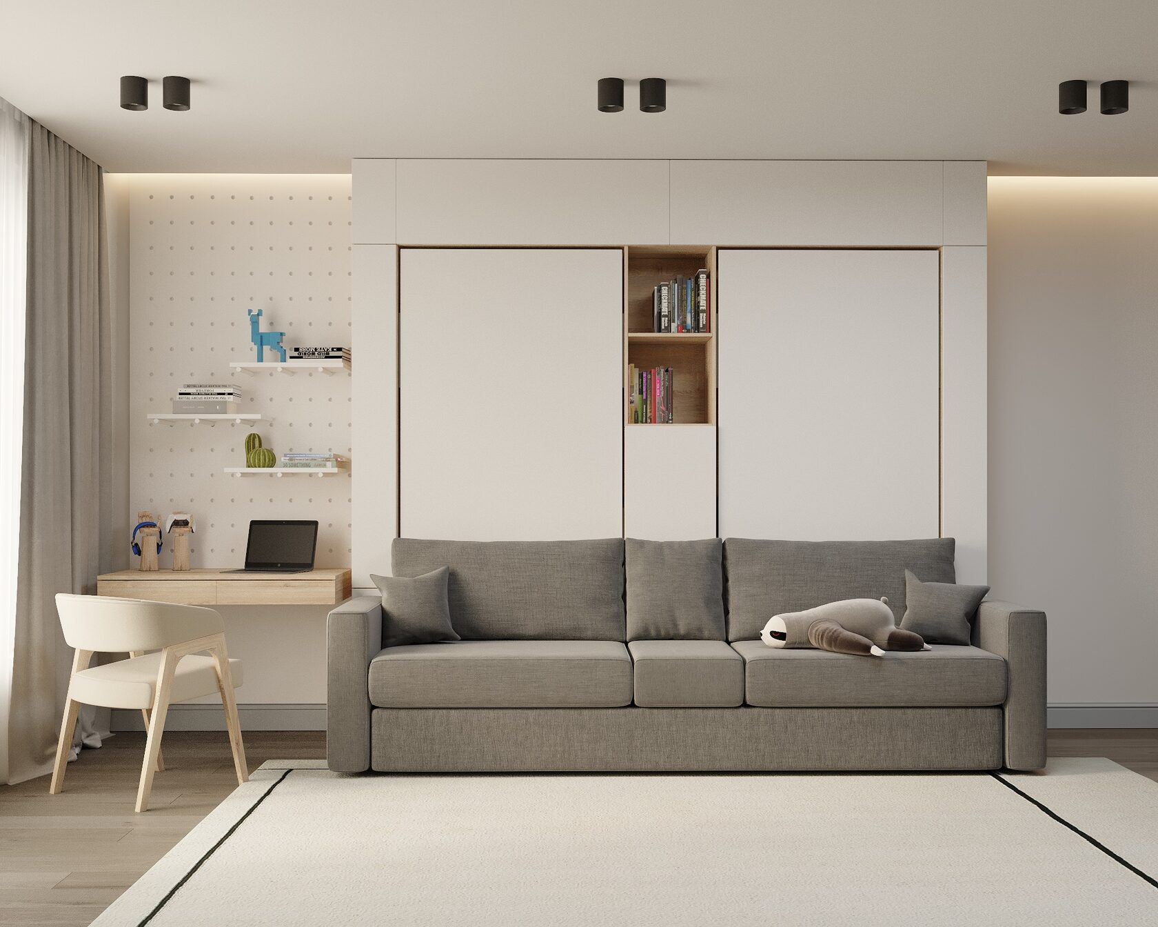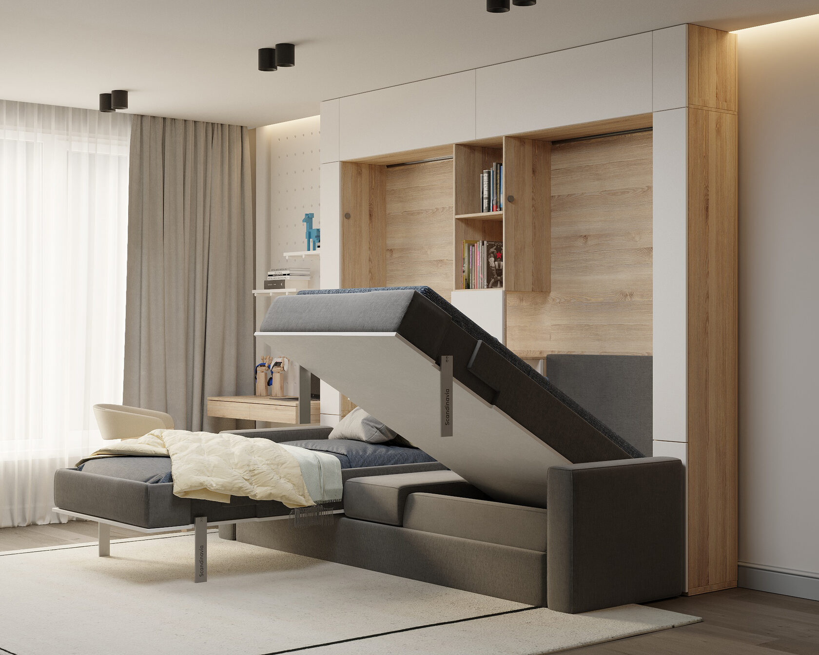 Наша мебель превращает любую комнату в три — спальню, гостиную и кабинет. Вам больше не нужно выбирать между комфортом и функциональностью.